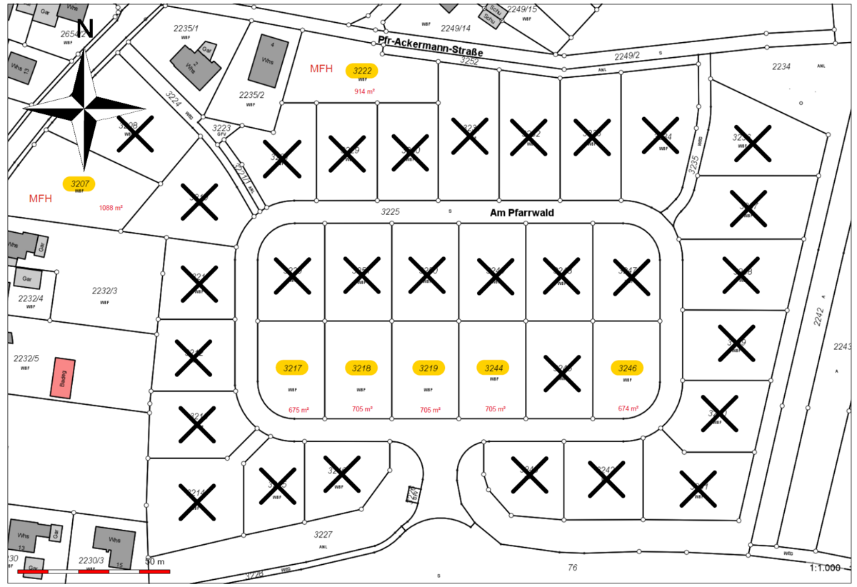 Beigefügt sehen Sie den Lageplan des Baugebietes. Die gemeindeeigenen Bauplätze sind gelb markiert. Die aktuelle Verfügbarkeit erhalten Sie auf Anfrage.